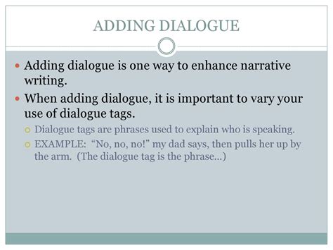 Web when writing a personal narrative, it is usually a good idea to include dialogue, or a character speaking. Find two short pieces of text,. It also discusses the importance of making sure that the dialogue does not overpower.