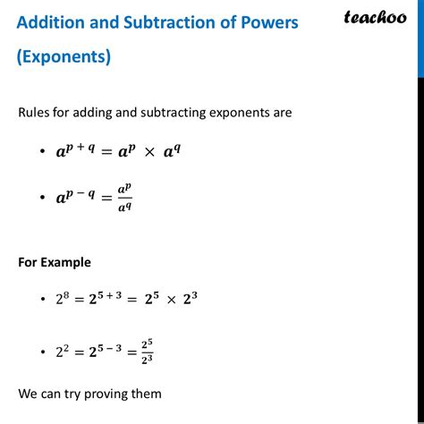 Web addition of exponents forms part of the algebra syllabus, and for this reason, it essential for students to have a stronger foundation in mathematics. Exponent rules are those laws that are used for simplifying expressions with exponents. Before performing any addition or subtraction between exponents we need to observe whether the base and exponents are the same or not.