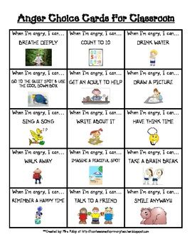 Choices for what to do when you're angry. Choice cards are given to support students in picking strategies to express. Free anger choice cards for.