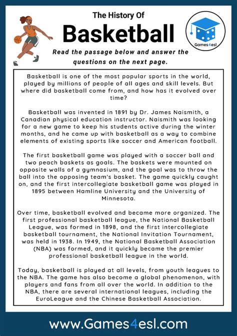 This reading comprehension worksheet is perfect for your child to brush up on their reading and. When did basketball become officially recognised as a winter. What was the basketball court missing?